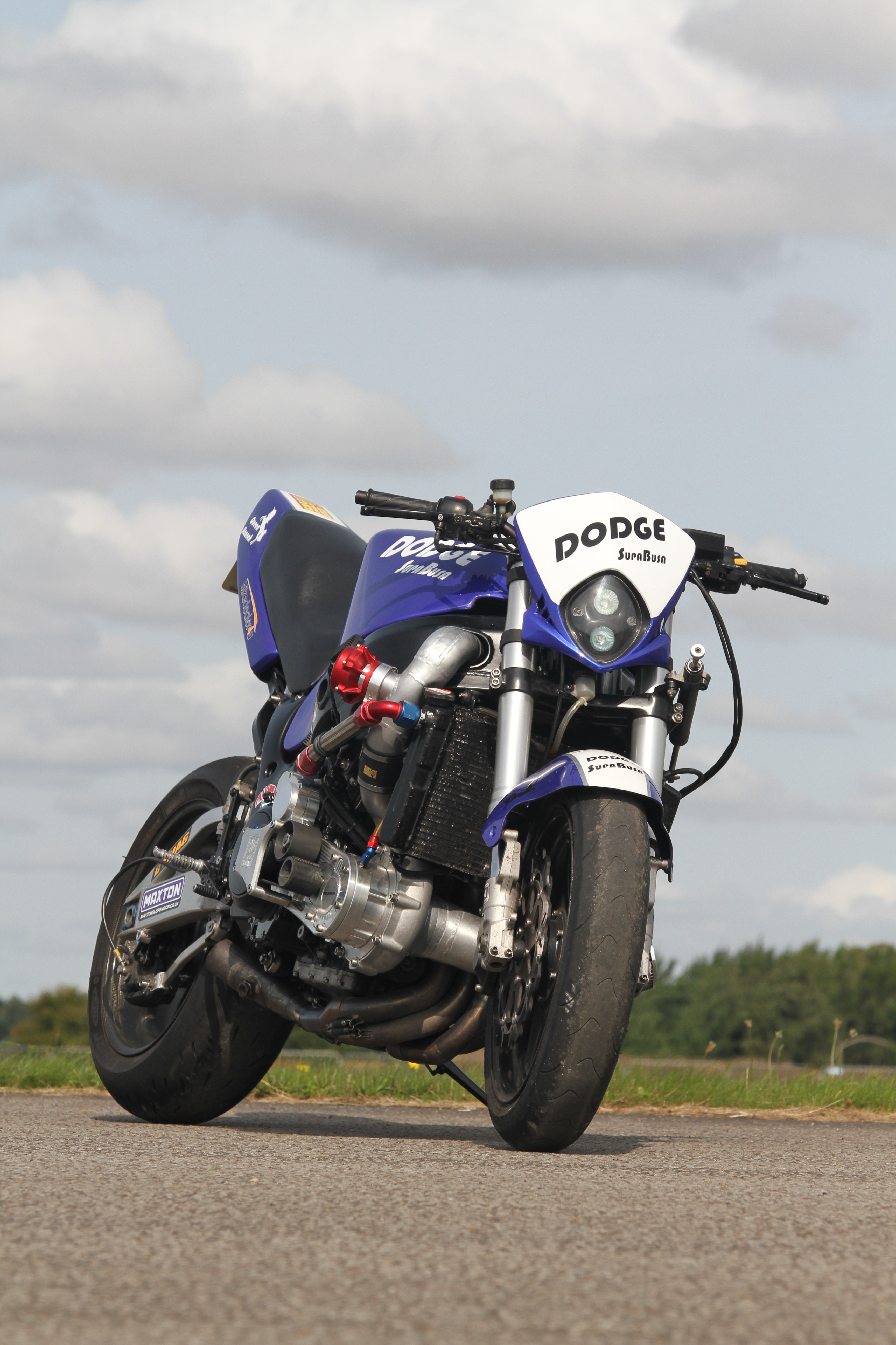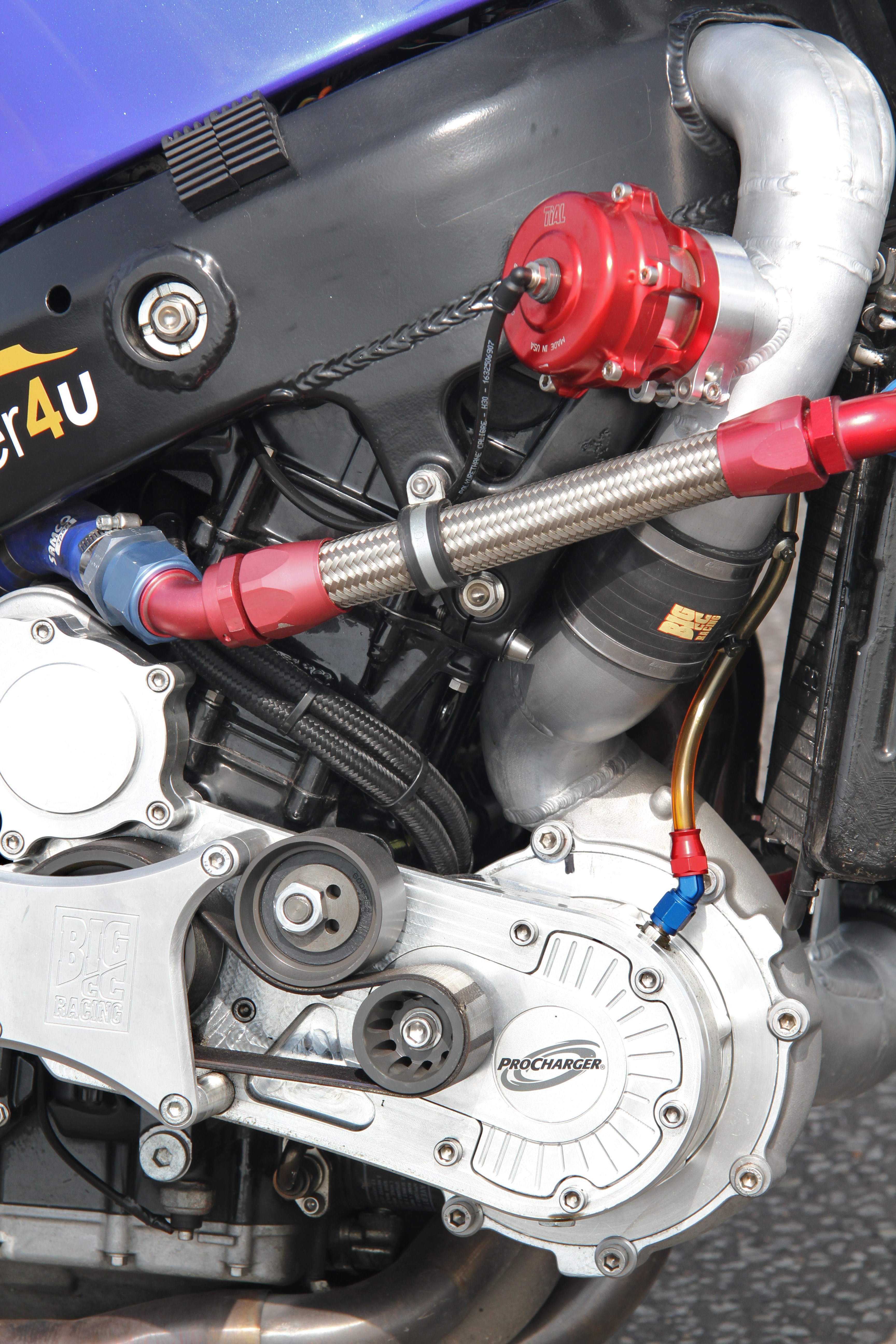 Nämä viritykset eivät enään riittäneet Dodgelle, jolla pyörän muutostyöt olivat jo muutenkin lähteneet laukalle. Dodge oli ottanut yhteyttä Big CC Racingin Sean Millsiin, joka todellakin tietää miten prätkistä revitään ulos kaikki mahdollinen teho. Yleisin ja “helpoin” tie on käyttää perinteisiä turbo ahtimia, mutta Dodge ei halunnut tälläistä pyöräänsä sillä hän halusi tehokkaan moottorin jossa ei ole mitään turbo viiveitä ja tarvittaessa kaasun reagointi on välitöntä. Niinpä Busan moottorin kylkeen päätettiin poikkeuksellisesti asentaa Prochargerin C1-R remmiahdin, joka nimensä mukaisesti pyörittää ahdinta remmillä. Tämän päätöksen myötä vanhat korkeapuristeiset 1363cc isolohko männät vaihdettiin matalamman rutun(10:1) omaaviin takomäntiin ja pyörässä olleet korkeapuristeiset männät asennettiin Dodgen toiseen “siviili”Busaan, jonka hän hommasi tämän pyörän vierelle…